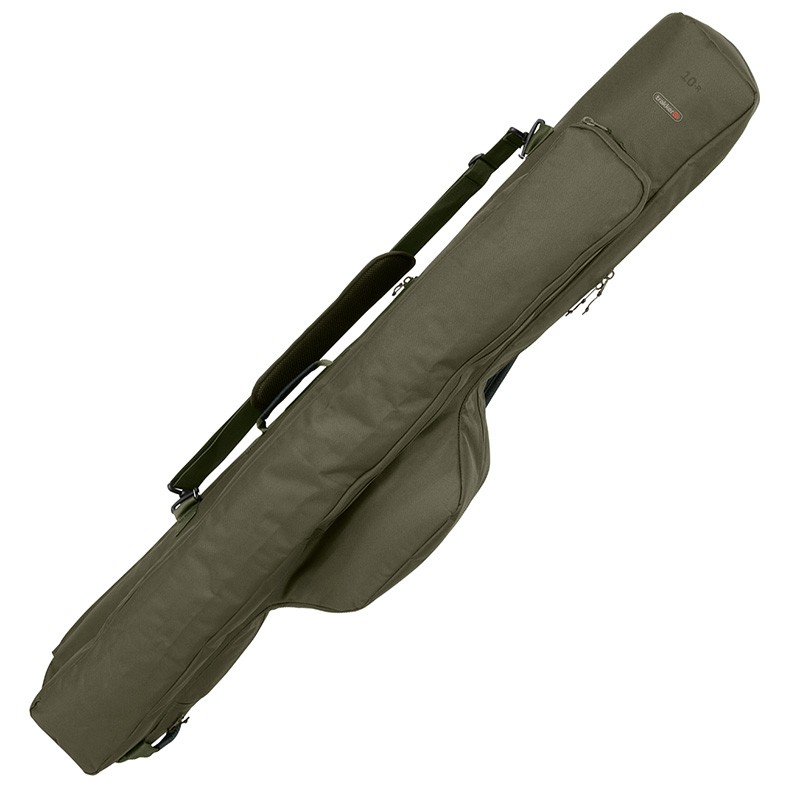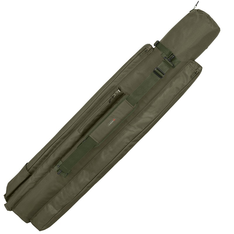 Features: • High-protection padded rod case for three fully rigged 10ft rods, plus storage for additional rod sleeves. • Widened tip sections to accommodate 50 mm K-series guides, zipped padded central divider keeps rods separated and internal bait launcher storage area. • Oversized and heavily padded reel pocket to protect the largest reels. • Large zipped front and rear pockets for slings, landing nets, distance sticks, and other accessories, plus a zipped pocket for lead weights. • Balanced carry handle and grab handles positioned for easy loading. • Removable and adjustable shoulder strap and D-clip for storage. • Durable n-dura fabric and heavy-duty zips. • Dimensions: 160 (L) x 28 (l) x 16 (H) cm. • Reel pocket: 40 (L) x 28 (l) x 25 (H) cm ; Tip: 16 (l) cm ; Butt: 16 (l) cm. • Weight: 2.4 kg. • Material: Polyester.