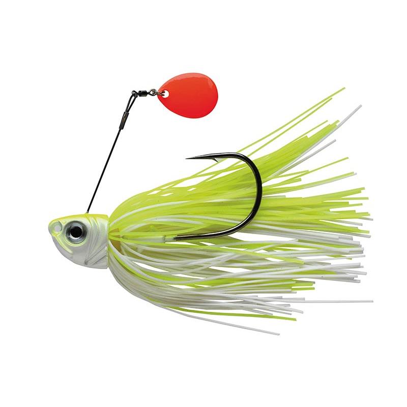 Designed with premium materials and components, the 1st Gen FlashX Swim Jig is the first of its kind to feature a titanium wire above the hook point, opposite an underspin blade. Equipped with a small no. 3 blade, the wire has been rigorously tested: it's strong enough to swim through obstacles, but light enough not to interfere with hooksets. Thanks to a blade positioned on top, the 1st Gen FlashX Swim Jig can swim near the bottom or on the surface, while continuing to spin the blade, producing bright flashes and additional vibrations. The wire and blade have been placed so as to allow the angler to slide the lure under obstacles, thus presenting to fish the body of a jig, with the reflections and vibrations of a spinnerbait. The recessed eyelet allows it to cut through the vegetation without getting caught.