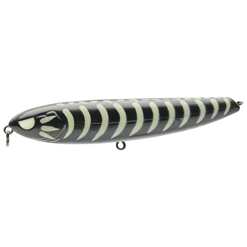 The Walking Haint 115 is packed with features designed to trigger surface strikes. It easily performs a back-and-forth motion (« walking the dog ») with the slightest rod twitch and casts long distances to reach actively hunting fish. Its unique dull-knock sound system (« one-knock ») effectively draws fish to the surface.