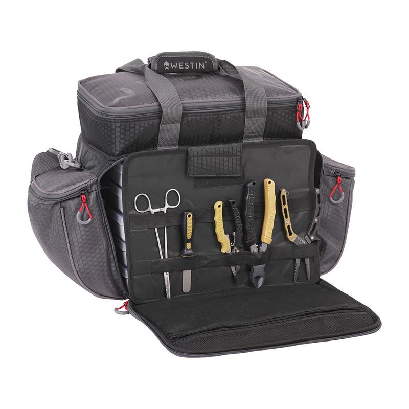 The W4 Master Lure Bag is the perfect solution to organize everything. The main compartment includes lure boxes and, at the front, you will find an organization plate for your tools. The top compartment is equipped with two removable and adjustable dividers. The W4 Master Lure Bag features a large mesh pocket, large side pockets for accessories, carrying handles and a removable padded shoulder strap.