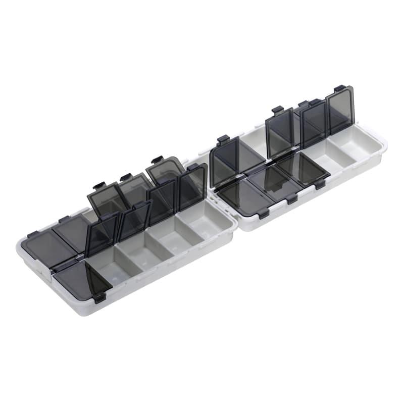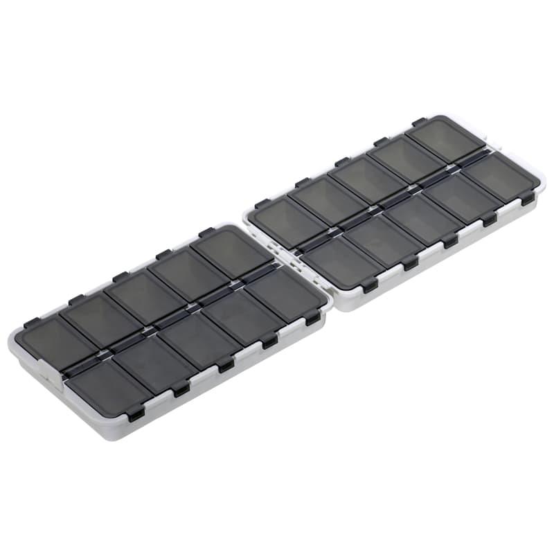 The FOLDABLE STORAGE BOX 13 measures 16,5x9,5x4,0 cm. With 20 individually closed compartments, it is ideal for storing small accessories such as swivels, snaps, hooks, beads, etc... Its white color provides effective solar protection, limiting heating. The smoked compartment doors protect against UV while allowing residual water to pass.