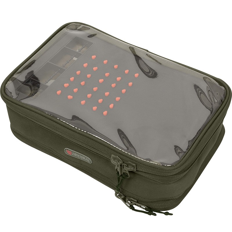 Pre-made rigs and booms up to 28 cm can be stored on the 30 cm x 20 cm EVA rigid board, which includes pins to keep the rigs secure. Transparent PVC panels on both sides allow immediate viewing of the contents, and a transparent zippered pocket inside, under the rigid board, provides additional storage options for parts or rigging tools.
