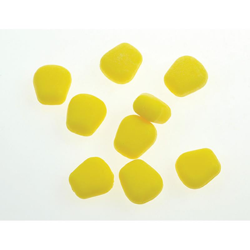 small floating artificial corn kernel in fluorescent color, which can be used on the hook or on a hair rig. in the latter case they can be added to a real corn kernel to create a balanced presentation. they can be used alone and thus allow for a popped-up presentation. their fluorescent color can pique the curiosity of fish in heavily fished spots.