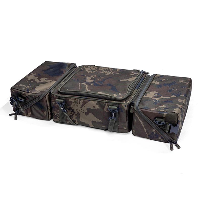 The bag favored by Alan Blair in the Subterfuge range, thanks to its workstation function, which optimizes space by sliding it under a bedchair or by laying it flat in a boat. Once open, simply access the necessary compartments or remove one or both compartments by unzipping them, thus allowing you to adjust the capacity according to the length of the session. For example, take one compartment with the essentials for tea if you need to join a friend at his spot, or another containing baits to prepare your spots. For short outings, simply remove the unnecessary compartments and leave them in the van or at home. The angled zip opening allows the side compartments to be folded down to create work trays, offering a full view and instant access to gear. An ideal solution for ultra-mobile anglers using a trolley.