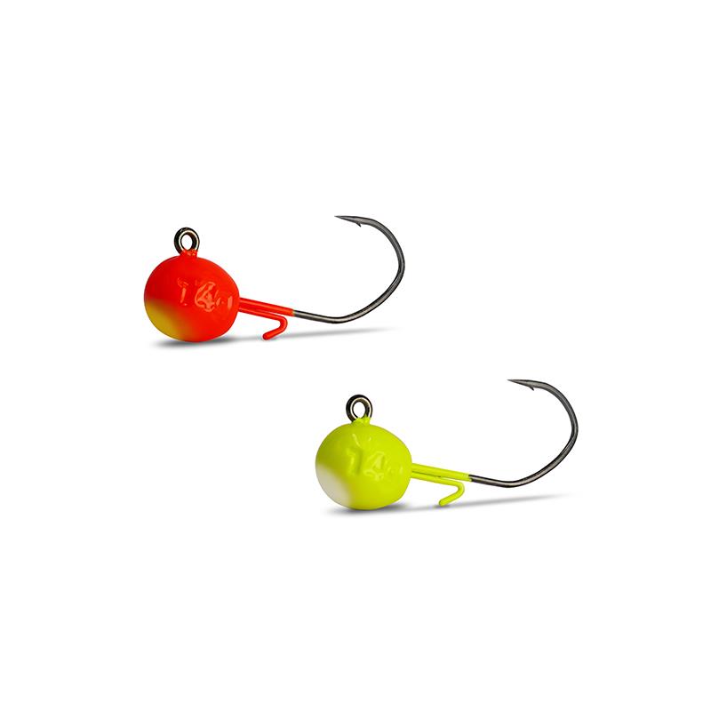 The pack includes a UV Chartreuse jighead and a UV Orange jighead.