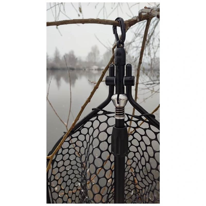 Allows the landing net to be securely attached to the ring of a fishing vest, to a belt, or to a backpack.