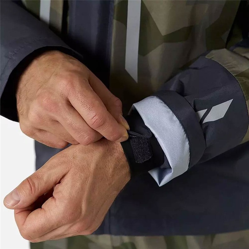this jacket features an anatomical cut at the elbow area, promoting natural freedom of movement and great flexibility. its tailored fit follows the body's contours, providing comfort and security without restricting movement. the integrated hood, adjustable on two levels, offers additional protection against wind and rain while maintaining a sleek profile. the elastic rubberized fitted cuffs, with adjustable straps and velcro closures, provide a personalized fit and optimal protection against the elements.
