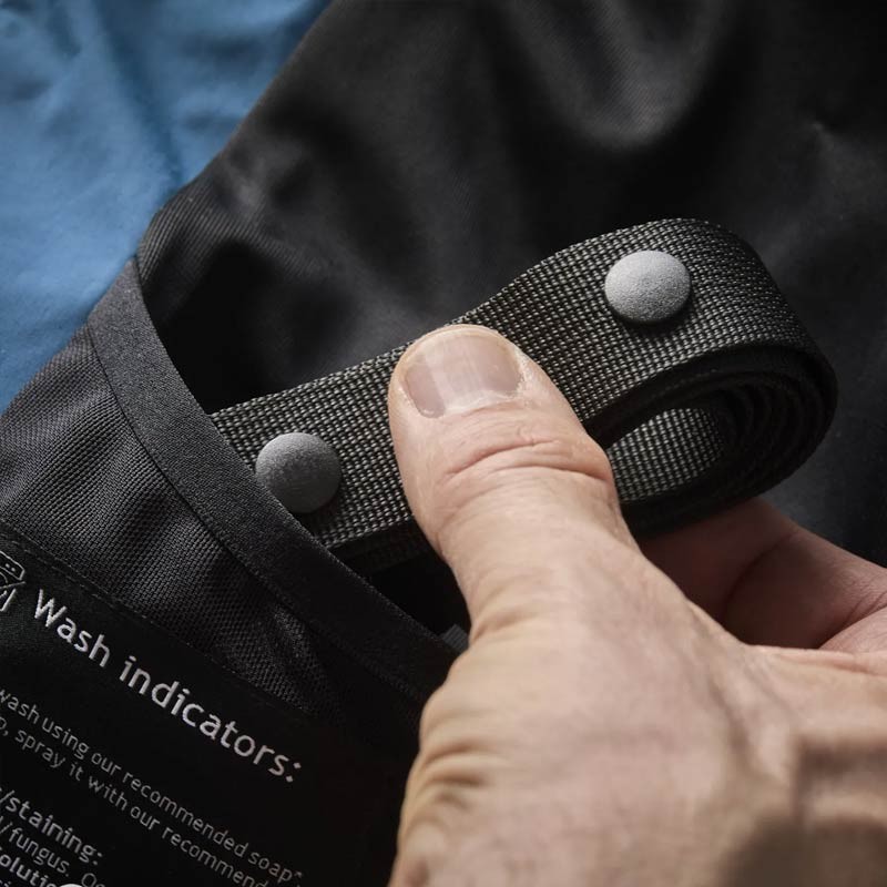 dozer light features a retractable shoulder strap system designed for hands-free carrying when the jacket is not breathable enough. the strap can be easily stored in a dedicated inner pocket when not in use.