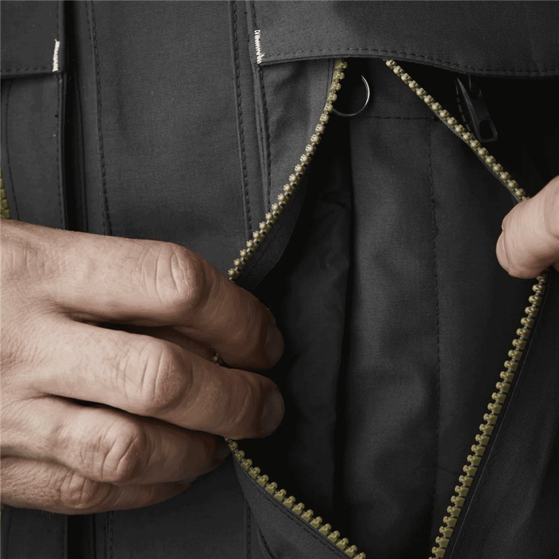 two large front chest pockets with ykk® aquaguard® zippers. these pockets expand according to their contents: they remain flat when empty but bulge when they contain something. the left pocket is equipped with an integrated retriever. large chest pockets with ykk® aquaguard® zipper. these chest pockets can expand if needed. an integrated retriever is built into the inside of the chest pocket.