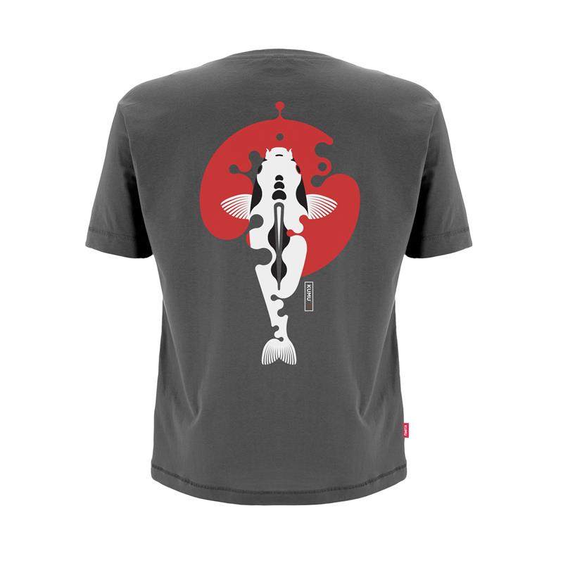 One of our most popular lines, reimagined in a beautiful slate grey. Our "Rising Sun" motif is heavily inspired by East Asian culture and beliefs. Throughout the creative process, we studied the use of the color red in Japanese art and its meaning. This, combined with our love for koi carp and their patterns, gave rise to what has become a timeless classic. Three-color screen print on an ultra-soft 150 g organic fabric with a woven side label.