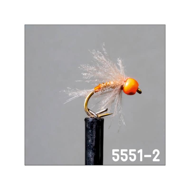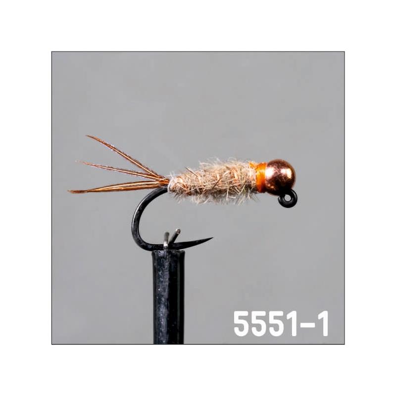 5551-1 : heavy basic straight nymph classified as an attractor nymph. tied with teased hare dubbing with tails to achieve a gliding, natural action. copper bead and wrap complemented by an orange hot spot (signal) on the thorax area to highlight the imitation.