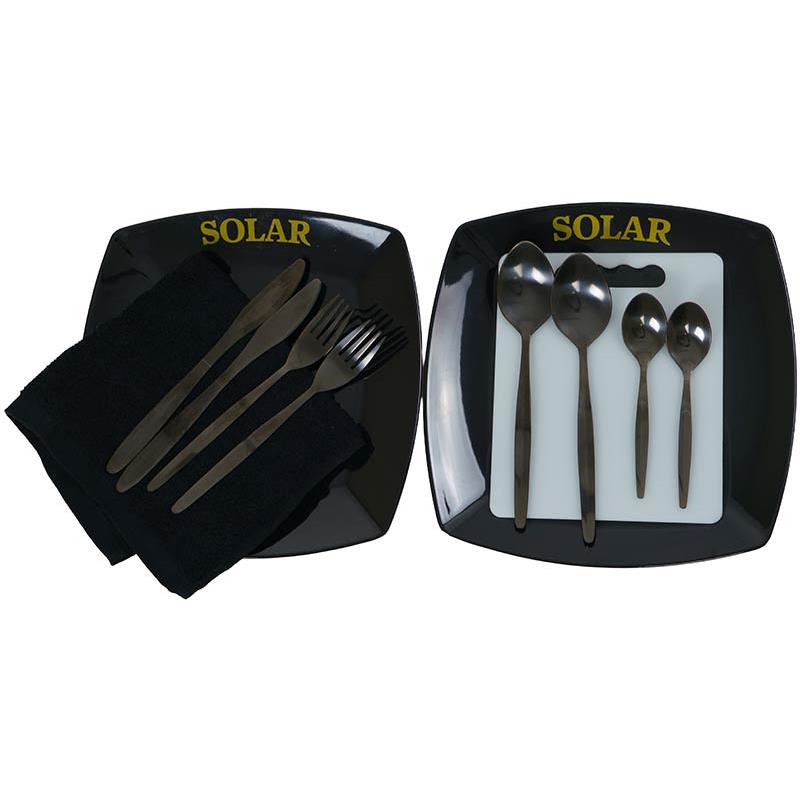 Supplied with two plates, a mini cutting board, two forks, two spoons, two knives, two teaspoons and a tea towel, it provides everything needed for comfortable dining on the bank.