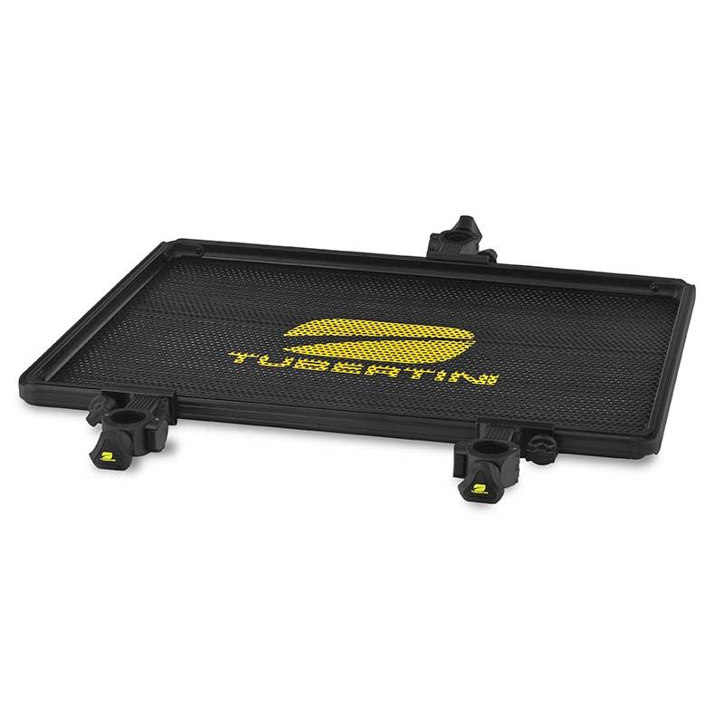 New concept of lateral side tray for station. The modular range allows adapting, and thus modulating, the trays and the supports attached to them to optimize the fishing position. The tray is made from a new aluminum profile on which the leg supports are mounted. These supports are sliding and removable to allow maximum flexibility of attachment to the basket and maximum compactness during transport since they are removable. The ability to slide these supports allows the angler to position the tray where he or she wants, more or less forward, fixed to one or two legs, with one or two support legs, etc.