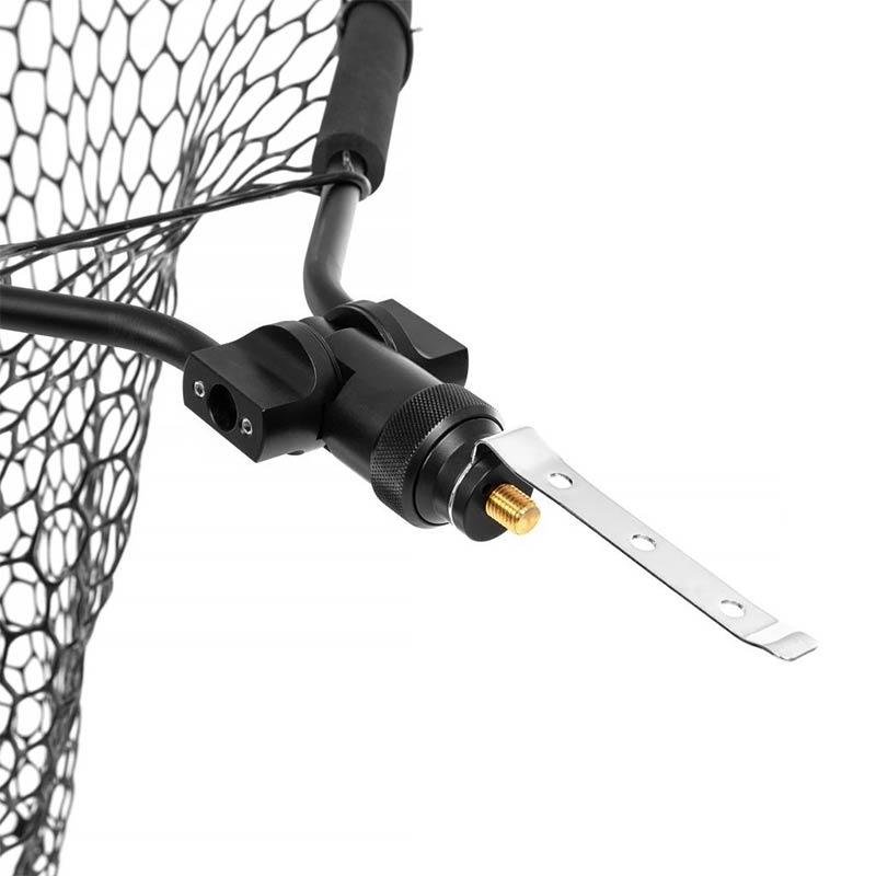 One-handed operation. After unlocking the latch, the net head can be easily lowered or locked in a linear position. An oversized central metal piece holds the net head firmly. The clip fixed to the net allows it to be attached to the angler's belt, which makes the net ideal for wading and always within reach.