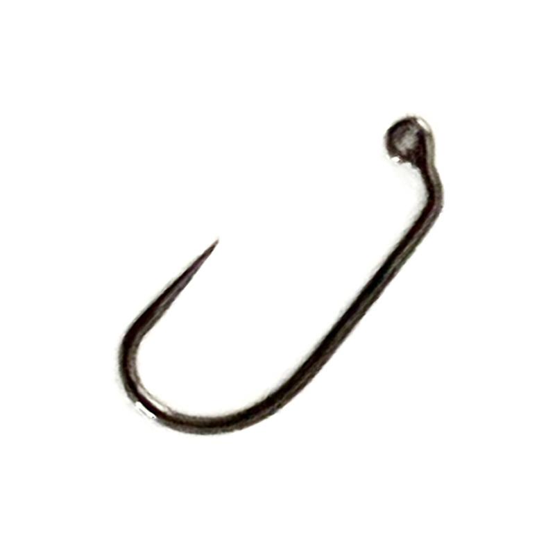 Chemically sharpened, high carbon density, semi-strong iron, dark nickel, standard shank, barbless point.