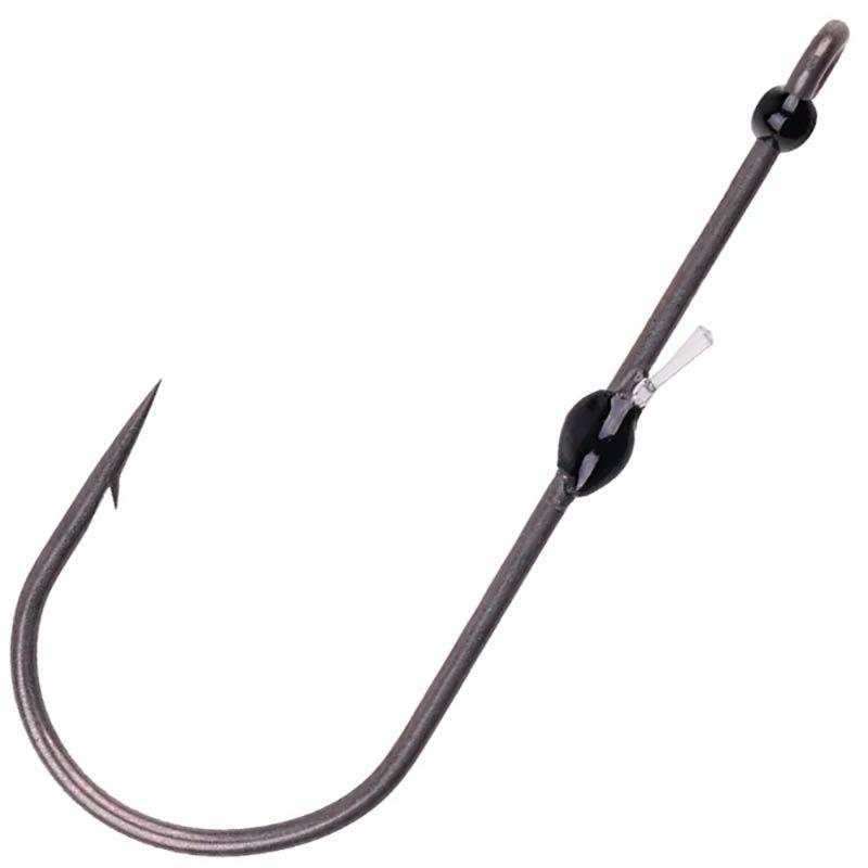 The Rushka Hook features a molded resin bead, accompanied by two small slightly protruding strands of fluorocarbon (adjustable to preference). This system allows the soft bait to be securely fixed on the shank of the hook without damaging it or risking it splitting during rigging – a common problem with more aggressive metal baitkeepers.
