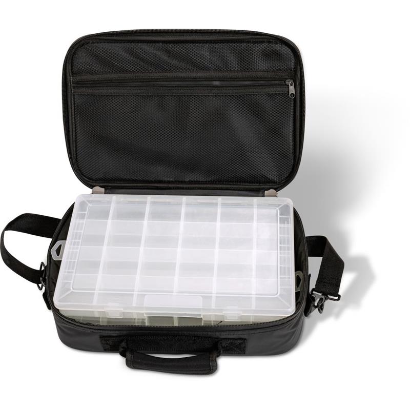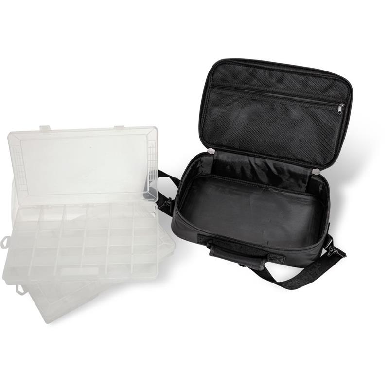 bolsa bandolera para pescadores de lanzamiento y pescadores activos, entregada con dos cajas de plástico, que ofrece espacio suficiente para las cucharillas, los señuelos blandos y los teasers. la bolsa es cómoda de llevar y resistente al agua y a la suciedad.