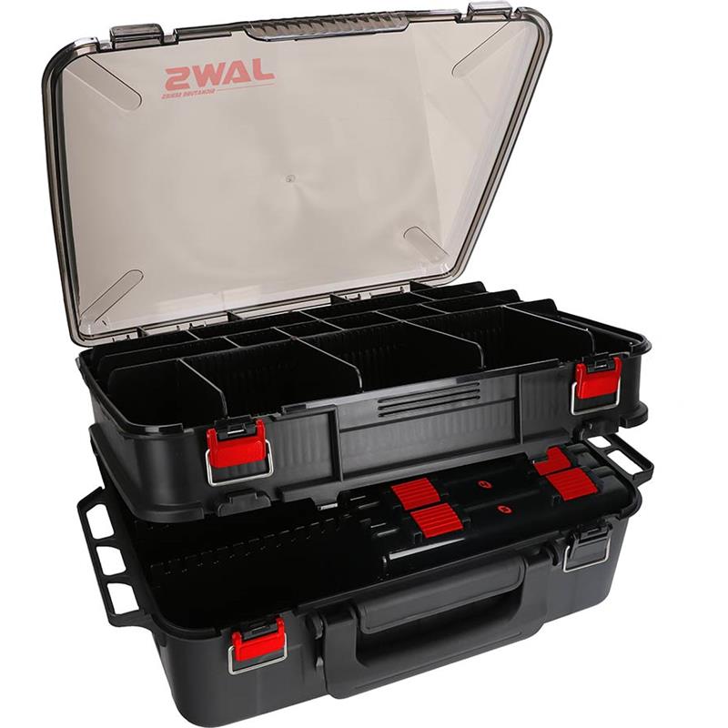 Esta caja de señuelos Jaws tiene 2 compartimentos grandes, el de abajo acoge 5 cajas de señuelos que miden 23 x 11cm y espacios para spinner baits y ondulantes. Los compartimentos son modulables.