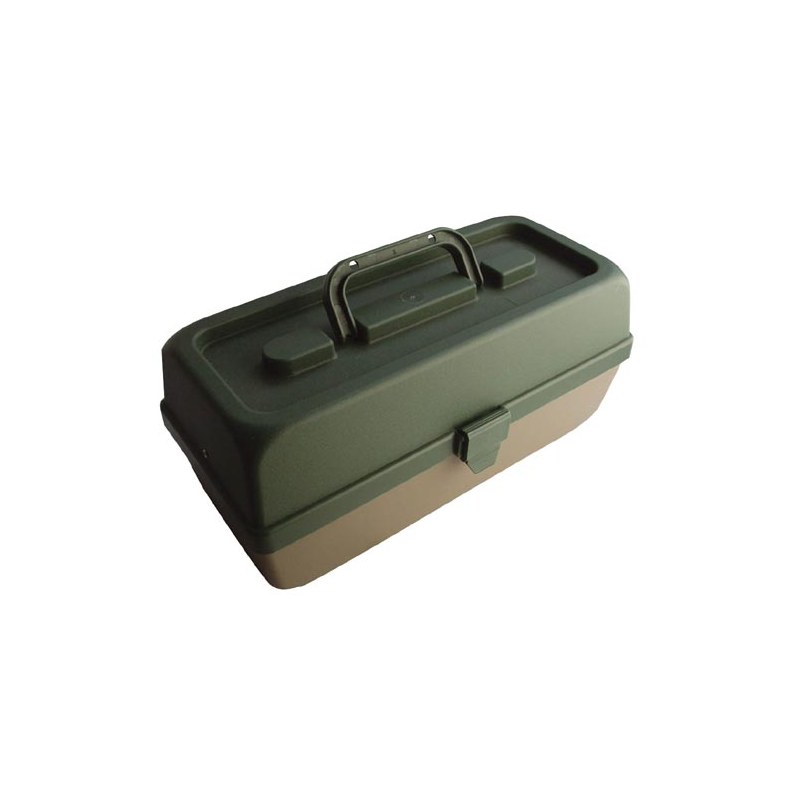 Dimensiones: 32 x 15 x 15 cm. Caja de 2 bandejas. Color de fondo: caqui y color de la tapa: verde.