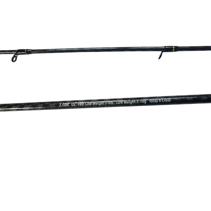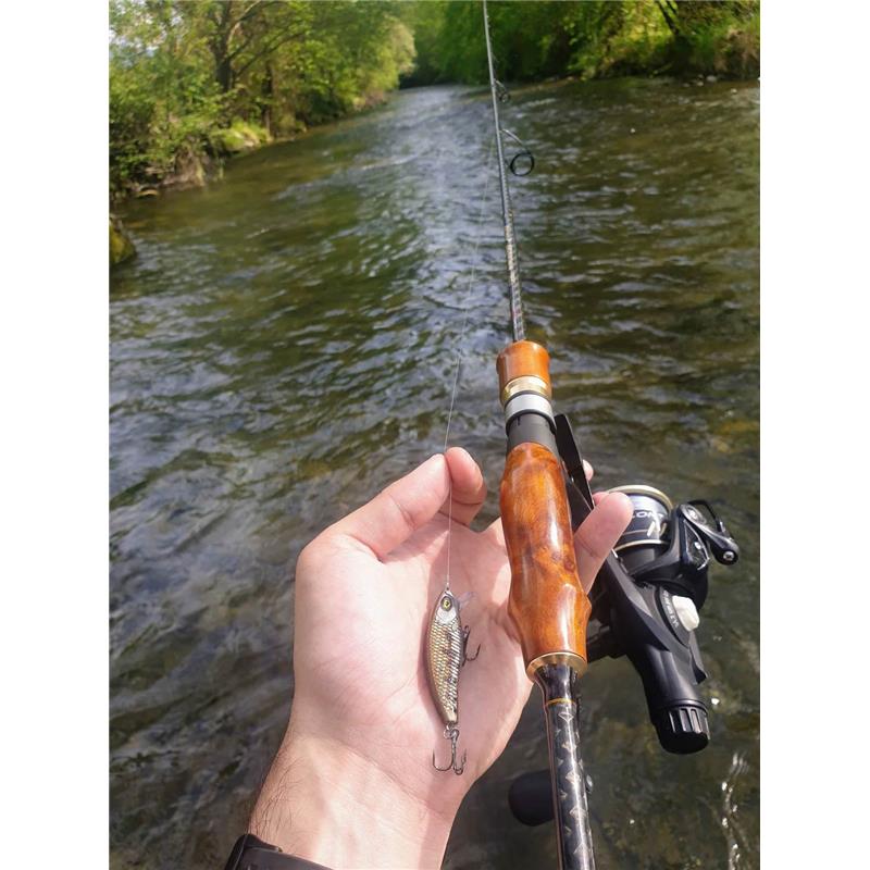 Es una caña ultralight de 3-10g y de una longitud de 210 cm. La empuñadura, más larga que la media (23cm entre el portacarrete y el talón) evita la fatiga: la caña se apoya bajo el brazo.