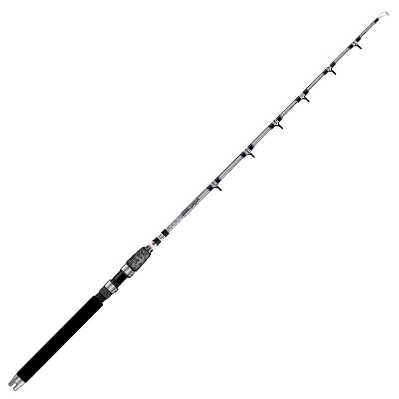 Caña de curricán de fibra de vidrio maciza, monopieza, cardán de grafito, mango EVA negro y camuflaje gris, anillas SIC. Existe en dos versiones, con anilla de punta de polea (naranja) o con anillas (azul)