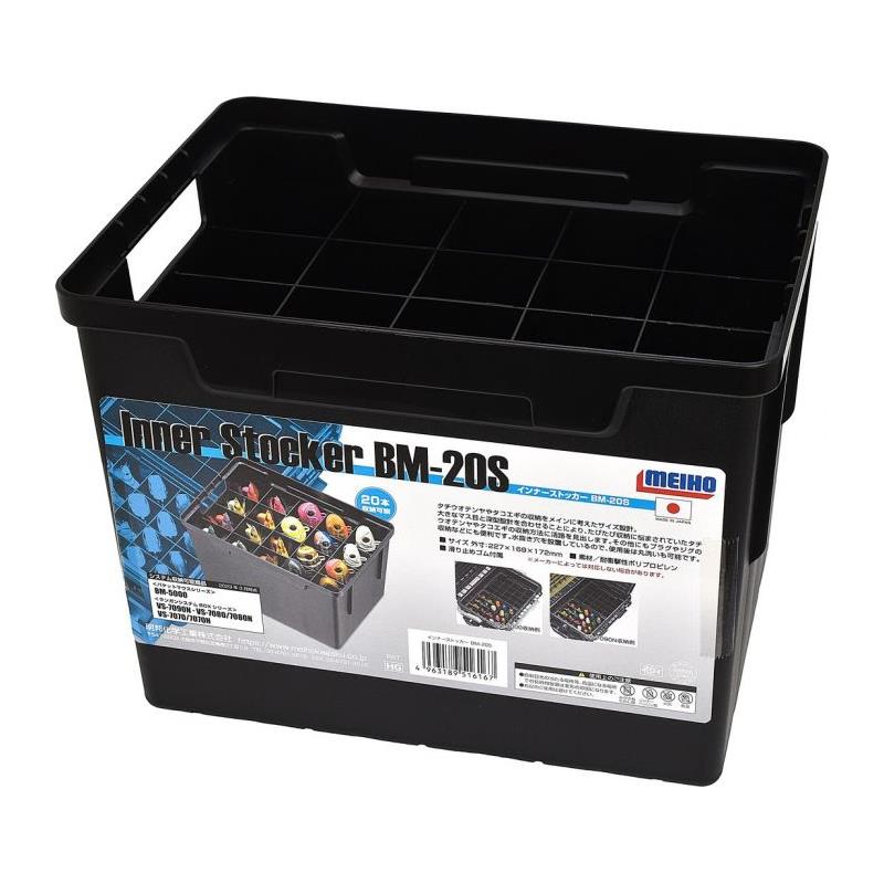 El Inner Stocker BM-20S es una cesta de almacenamiento muy resistente que contiene 20 compartimentos de 37mm por 40mm pensados para alojar señuelos duros, turlutas u otros jigs metálicos en posición vertical. También dispone de dos asas para facilitar su transporte y de orificios de drenaje que permiten la evacuación del agua durante el enjuague de los señuelos. La cesta INNER STOCKER BM-20S se adapta perfectamente al interior de las cajas MEIHO VS-7090, VS-7080 y VS-7070.