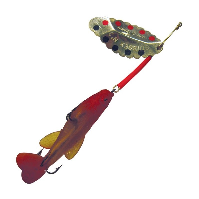 Cucharilla a piscardos SUISSEX especial truchas y depredadores. Paleta argén u oro/puntos rojos y negros. Piscardos montados con 2 anzuelos. Vendido con 1 bajo volantín plomado.
