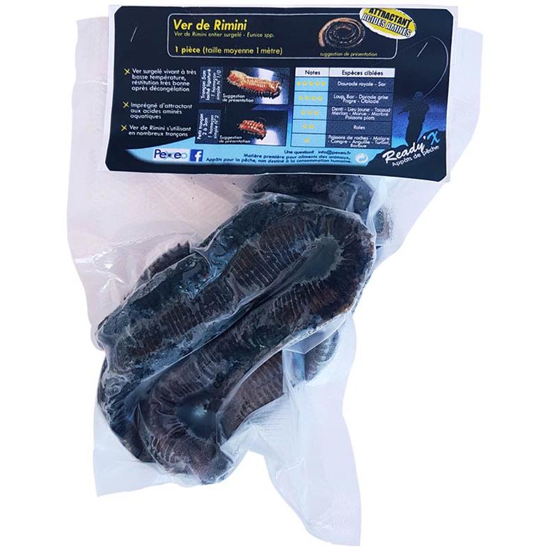 El gusano de Rimini es seguramente el gusano más imponente del Mediterráneo. ¡Puede llegar a los 2 metros y pesar casi 500 gramos! Es importante mencionar que es un gusano carnívoro, hay pocos así en el mundo. Pero lo más importante para nosotros los pescadores, es que es un cebo formidable y resistente. Desprende olores incomparables, ideal para los sparidae (doradas, pargos) y los lubinas en surfcasting. Consejos: es un cebo a utilizar en trozos de 2-3 cm que se atan con hilo elástico muy fino para mantener una forma alargada. Se recomienda mantener el producto congelado en nevera para una calidad óptima.