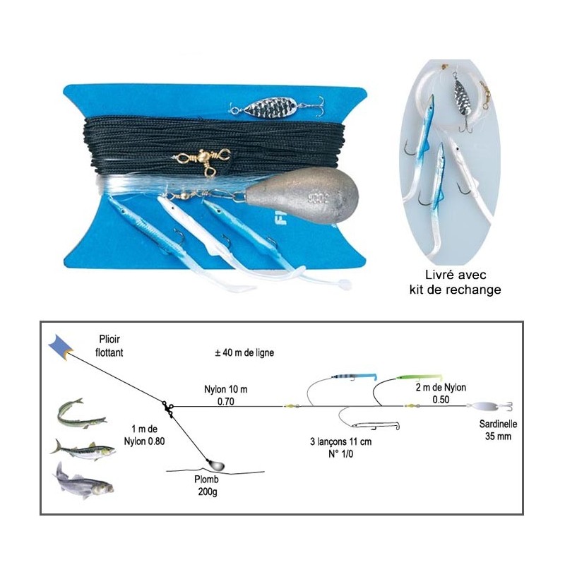 la línea de curricán incluye: - portabajo flotante. - potencia nilón 1 m en 80/100 con plomo 200 g. - Línea nilón 10 m en 70/100 con 3 potencias amoditas 11 cm n°1/0. - Bajos de línea nilón 2 m en 50/100 con Sardinelle 35 mm.