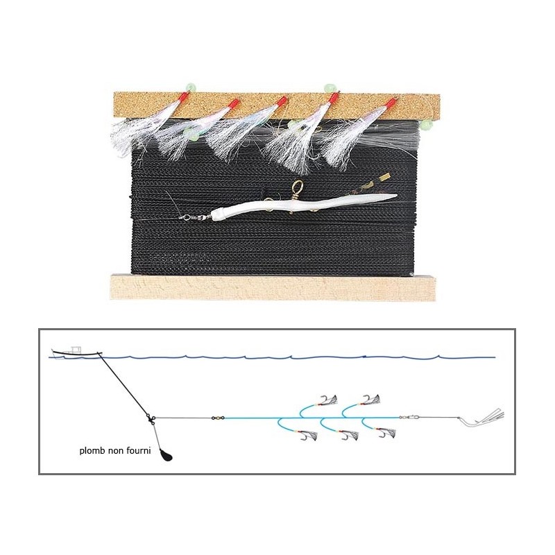 Línea de curricán NUMERA OESTE Manga-Atlántico para pesca de lubina, Caballa y Aguja. UTILIZACIÓN: Conectar a su plomo al Emerillón pater noster, por un nilón (rompiendo) de 40/100 y 1 m de longitud. Esta longitud es necesaria para hacer trabajar la línea sobre el fondo, sin colgar. un plomo de 300 a 500 g es, por regla general, suficiente para una pesca a fondo o entre dos-Agua. CONSEJOS: Velocidad de curricán lenta (2 a 4 nudos). Cuanto más la velocidad es elevada, más el plomo remonta en superficie, lo que permite, haciendo variar la velocidad, excavar toda la altura de agua.