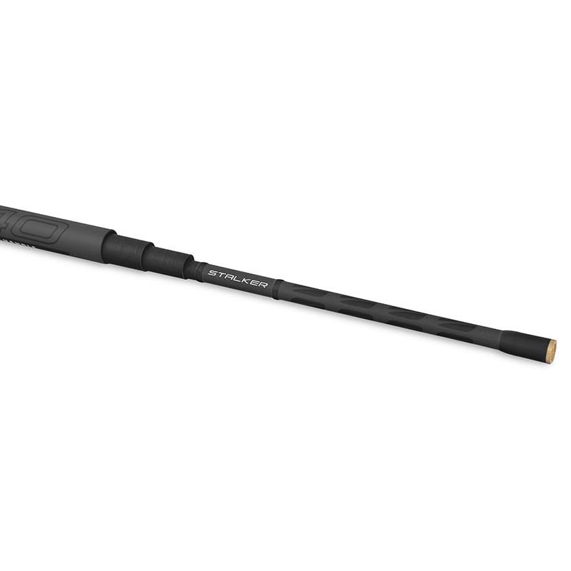 Mango telescópico de perfil fino, íntegramente en carbono, con refuerzo exterior en X-wrapping.con refuerzo exterior en X. Está equipado con un casquillo roscado en latóncon una envoltura en nylon y un capuchón trasero en aluminio. Secciones internas en acabadoacabado negro mate.