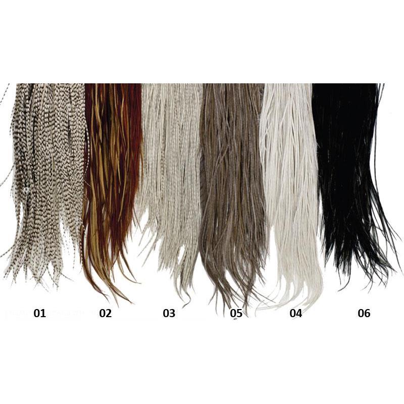 Lindas plumas largas y regulares, a las fibras tiesas y brillante. La mitad microbarb permite montar alrededor a de 400 moscas. colores: oso gris/rojizo/gris/gris claro/gris oscuros/negros.