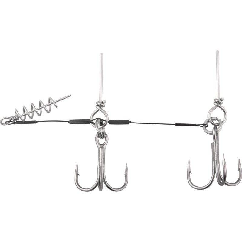 Montaje completo tornillo de montaje + 2 anzuelos sobre bajo de línea de acero para armar señuelos blandos de todos los tamaños. Inserciones extraíbles de fijación de anzuelos para que el señuelo se separe del bajo de línea durante el combate y evite dañarse, reduciendo además la pérdida del pez capturado.