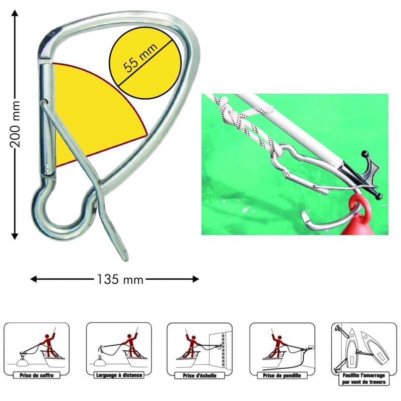 Mosquetón de fondeo, para amarrarse rápidamente sobre Cuerpo-muerto, bloque, boya, recuperar y desplazar rápidamente una cuelga.