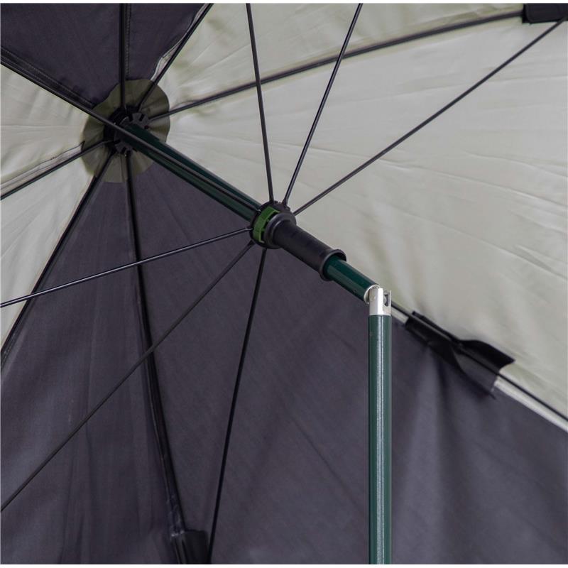 paraguas de pesca de alta gama con un diámetro de 250 cm (medido a través de la lona). 100 % impermeable, con costuras termosoldadas, ajuste del ángulo y paredes laterales. el refugio perfecto para todo tipo de tiempo. acabado en el diseño de la serie method feeder.