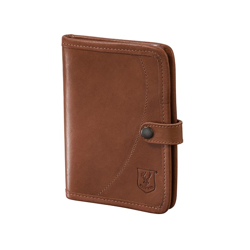 Elegante portador de licencia de caza de cuero toscano plano y compacto tan vegano, con insertos de portadocumentos de plástico intercambiables y portabolígrafos.