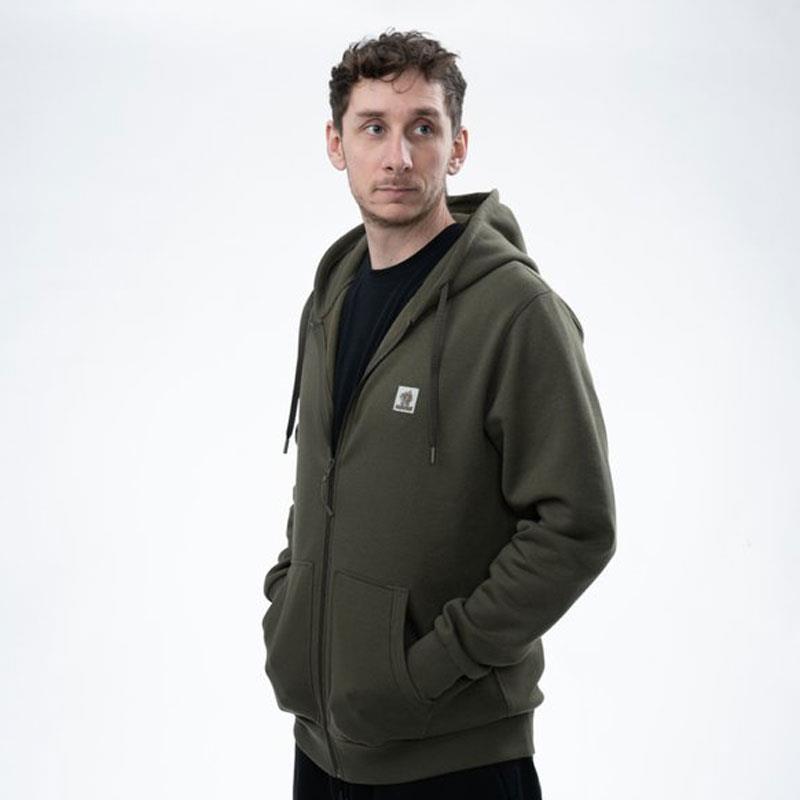 Versión con cremallera de la sudadera con capucha MIH Badge, para ajustar la temperatura fácilmente sin tener que quitarte una capa. Disponible en Verde o Negro, de la talla S a la XXXL.