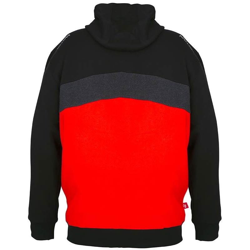 Características : • 80 % algodón, 20 % de poliéster 320 g/m² • Corte confortable con capucha con cordón • Diseño moderno tricolor en rojo, negro y gris oscuro mezclado • Exhibición prominente de los logotipos en el frente y los lados.