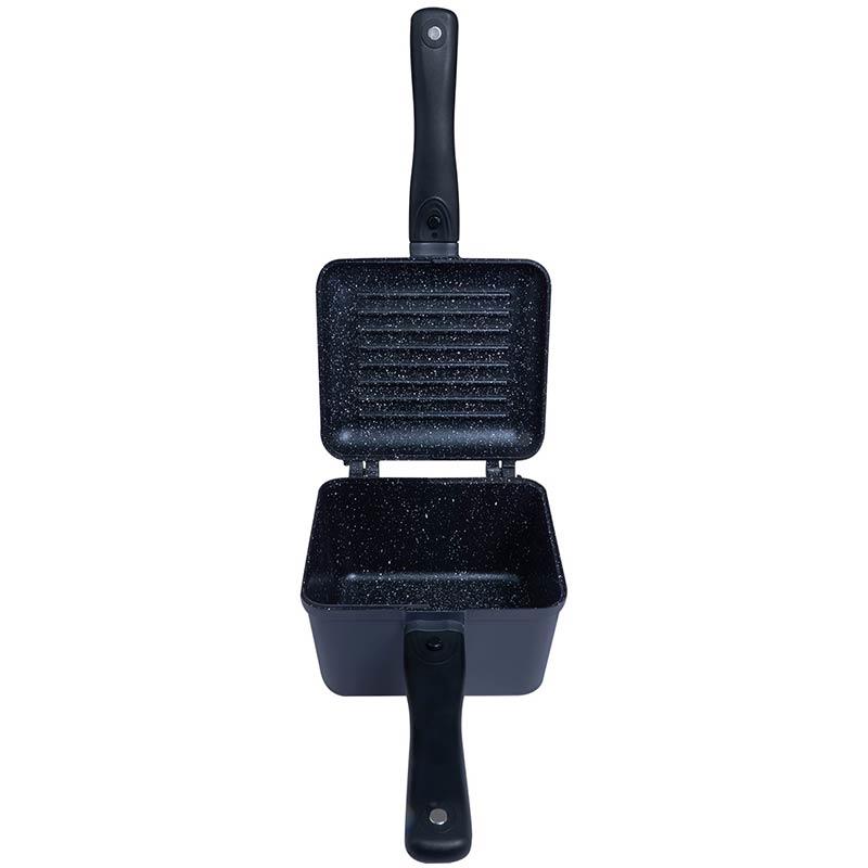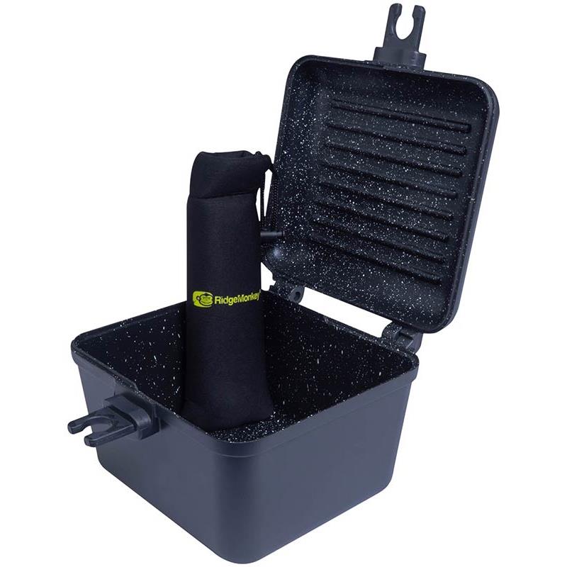 La sartén puede servir de tapa para la cacerola, o puede ser desmontada para convertirse en una sartén independiente, permitiendo así preparar dos platos al mismo tiempo. Esta sartén también es intercambiable con la tostadora RidgeMonkey Connect Granite Edition.