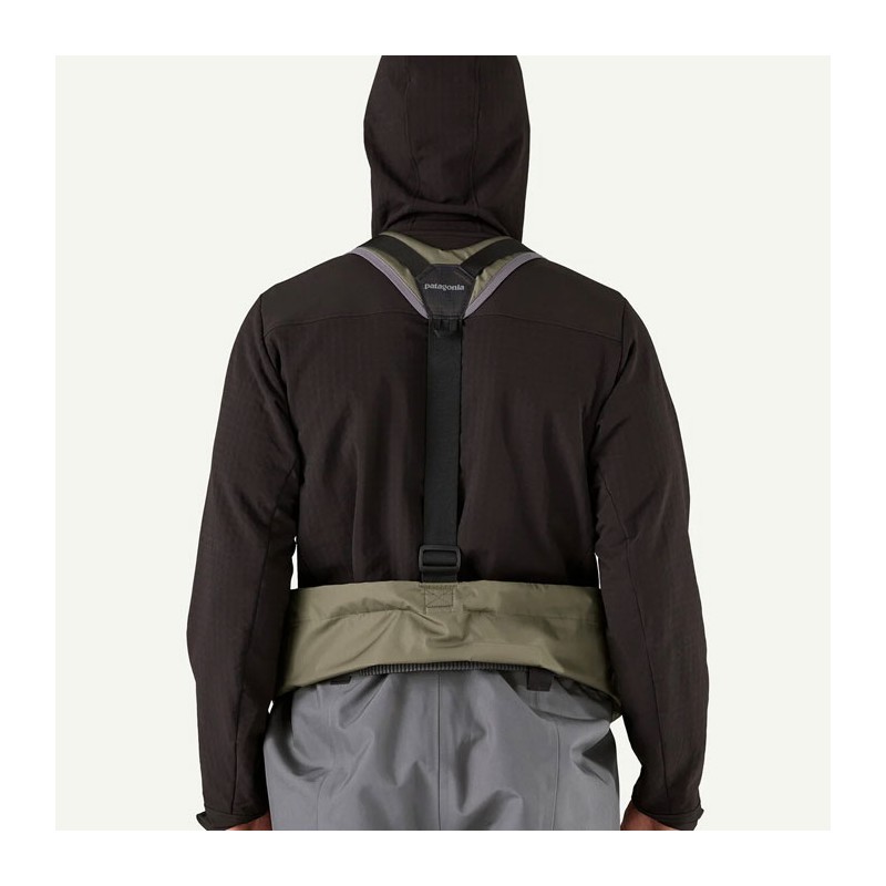 tirantes totalmente ajustables que se desmontan rápidamente para plegar fácilmente la parte superior del vadeador hasta la cintura ; cordón de ajuste en la parte superior de la prenda ; cinturilla secure stretch