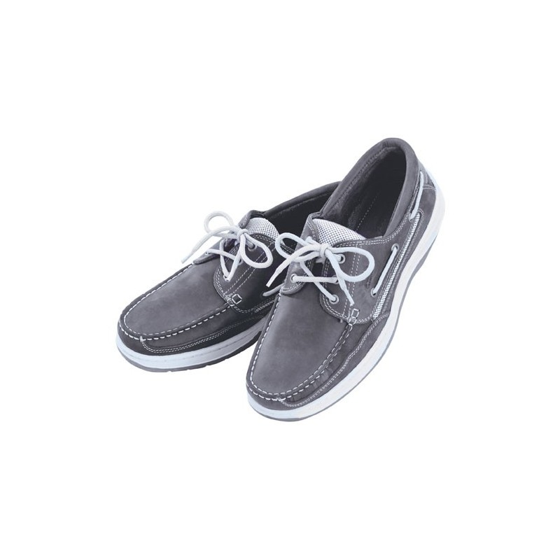 un corte deportivo para un zapato de puente nueva generación potente y cómoda: de cuero becerro jersey up flexible con canesúes laterales en malla red que respira; enteramente forrado cuero becerro; primera acolchada amovible antichoques forrado de industria textil antibacteriana; suela muy flexible 100% caucho a alta estabilidad lateral y canalones de evacuación para una adherencia excepcional sobre puente húmedo. Cosido lateral alta resistencia y cordón nilón.