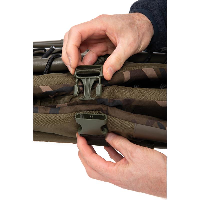 • Des sangles latérales permettent de ranger le bedchair de manière compacte.