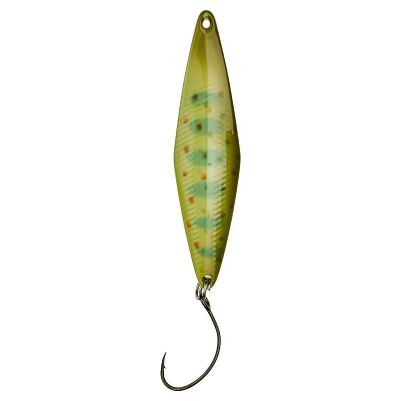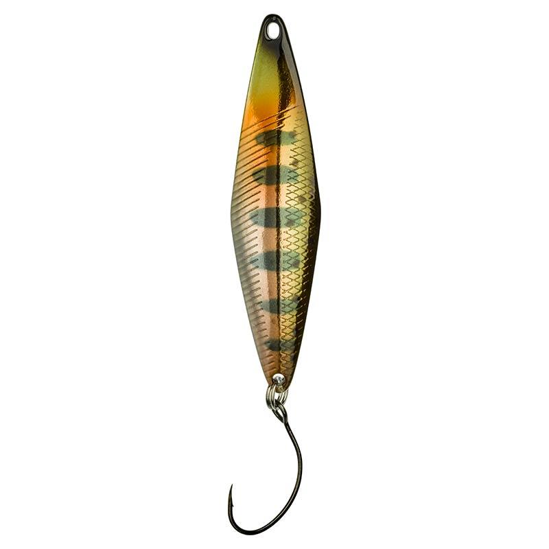 La TRICOROLL SPOON est la déclinaison en cuillère ondulante de la célèbre gamme de poissons nageurs destinée aux salmonidés. Elle reprend les caractéristiques qui ont fait la réputation des Tricoroll: une nage avec un rolling prononcé et une excellente tenue au courant. Cette nage à l’équilibre subtile est obtenue grâce à une coupe longue et étroite et un galbe creux prononcé. La forme de la TRICOROLL SPOON lui interdit de remonter intempestivement et l’empêche de tourner sur elle-même, même dans les courants puissants. De plus cette forme autorise des lancers longs et précis. Cette cuillère ondulante s’utilise aussi bien avec une bannière assez lâche afin de la laisser travailler avec le courant ou bannière tendue en travers ou ¾ aval pour traverser des courants puissants. Sa nage ne laissera pas indifférent les gros salmonidés des grandes rivières, des lacs ou encore les truites de mer de la Baltique. Ses attributs la destinent également à la pêche de l’Aspe.
