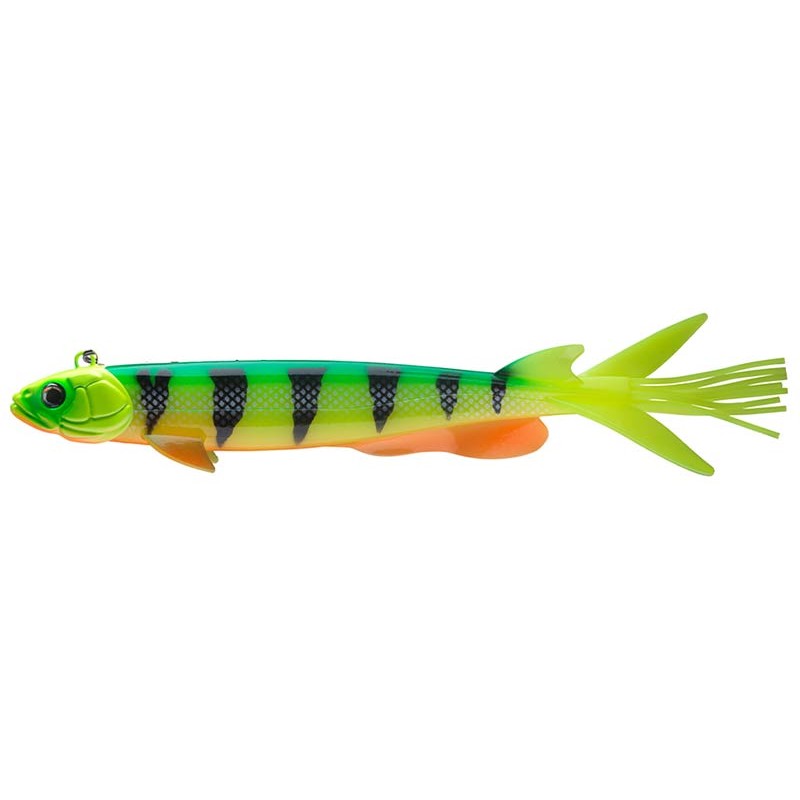 Leurre prêt à pêcher pour la pêche en bateau en prospection active pour la traque des plus gros carnassiers (brochets, sandres specimens en “sharp shooting”). Descente rapide sur zone, fortes vibrations provoquées par les appendices de la caudale, hameçon triple puissant.