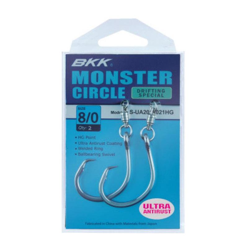 amo a cerchio « pesce grosso » con girella barilotto e rivestimento antiruggine. la pesca dei grandi pesci (tonni, squali, pesci spada, pesci « exo ») non tollera alcuna debolezza e il livello di esigenza del materiale scelto deve essere all'altezza della taglia dei pesci ricercati . il monster circle hook è dotato di un occhiello forgiato e saldato a freddo garantendo una solidità ottimale dell'amo nel suo insieme. la forma del monster circle, basata sul principio dell'auto-ferraggio, permette di infilzare i pesci sull'angolo della bocca e di rilasciarli più facilmente.
