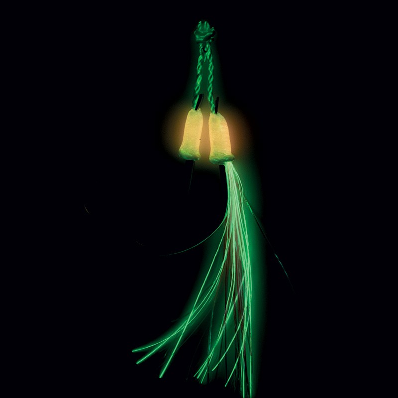 Double Assist montato con un amo LIGHT PIKE TINNED e un PE luminoso bicolore (verde/bianco) per un uso pratico sulla parte anteriore delle esche leggere per jigging, casting o jig-casting.