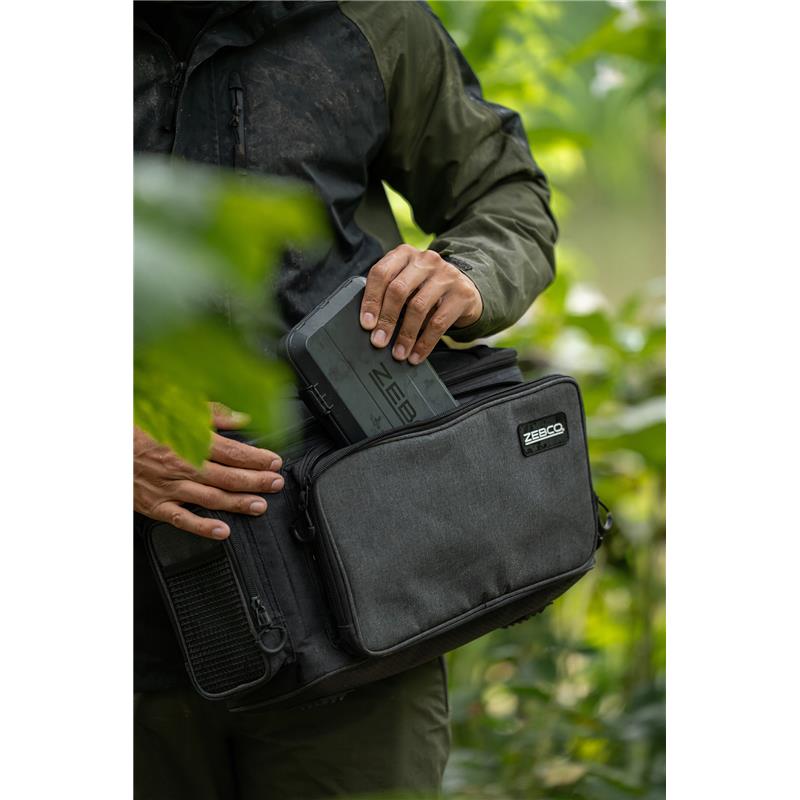 Questa borsa da trasporto spaziosa è dotata di tre scatole e presenta tre tasche esterne. Dispone anche di una piccola tasca trasparente situata all'interno del coperchio che consente di riporre i documenti e i piccoli articoli per le montature. Vi è inoltre un punto di aggancio sulla parte esterna per l'attrezzatura e altri piccoli articoli da pesca.