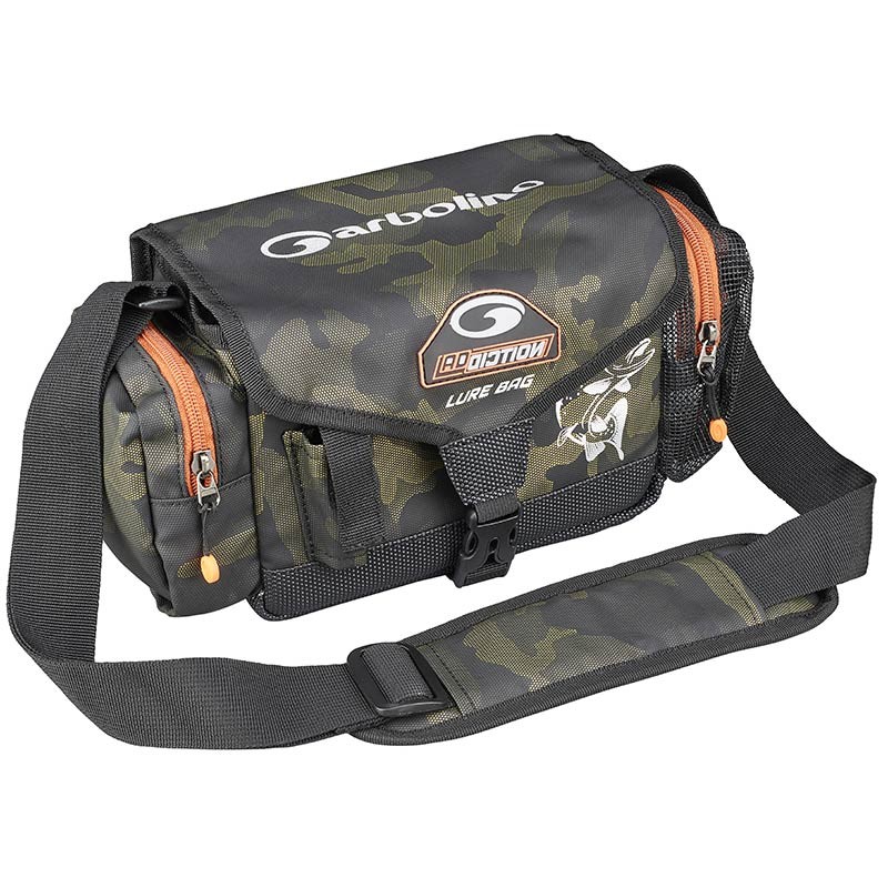 • borsa per esche con 3 scatole rimovibili compartimentate • ideale per lo stoccaggio di piccoli minnow o esche morbide • tasche laterali con cerniera per il deposito degli accessori, una in rete gommata e l’altra in tessuto, tasca anteriore per pinza • tracolla regolabile. • tessuto effetto mimetico.