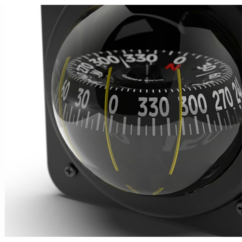 La capsula trasparente consente la lettura dall'esterno e dall'interno dell'imbarcazione. Angolo di beccheggio illimitato e rollio 30°. Stabilità eccezionale in tutte le condizioni, insensibilità alla velocità o alle vibrazioni, lettura orizzontale o verticale. Le tre alidade permettono la lettura della rotta con uno spostamento laterale di 45° consentendo l'installazione della bussola accanto alla postazione di guida.