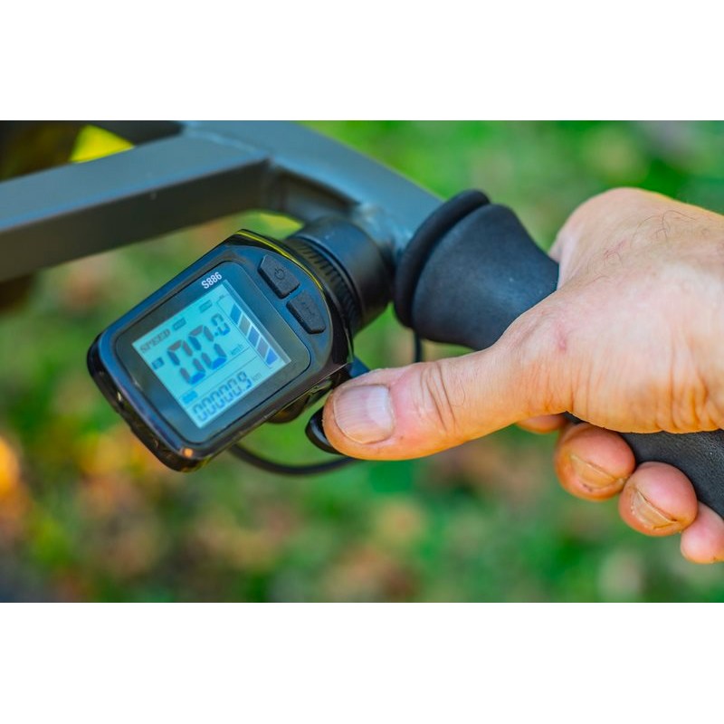 Il controller di potenza Micro Touch (MTPC) è dotato di un comando con il pollice facile da usare, la cui posizione può essere modificata per un comfort massimo. Lo schermo LCD dispone di un indicatore di livello della batteria a 6 punti, permettendovi di avere sempre un'autonomia ottimale, anche se la carriola motorizzata SP C-TECH vanta un'autonomia impressionante.